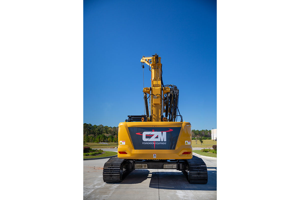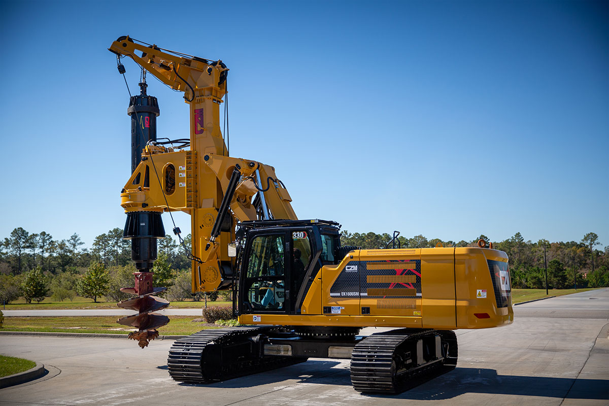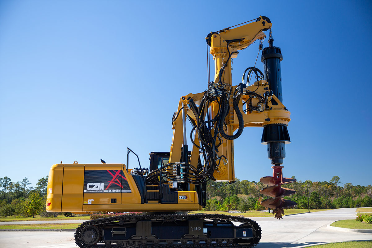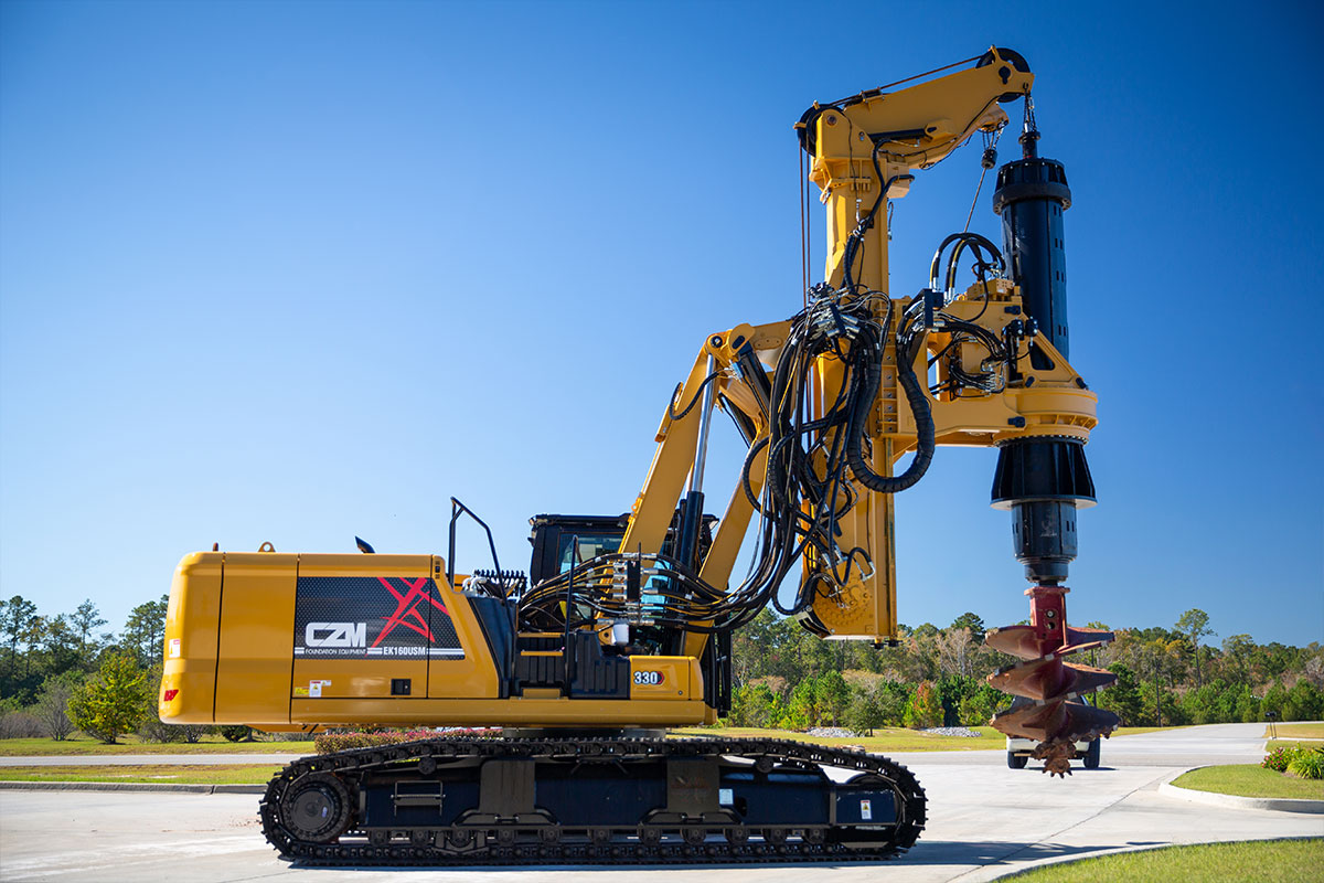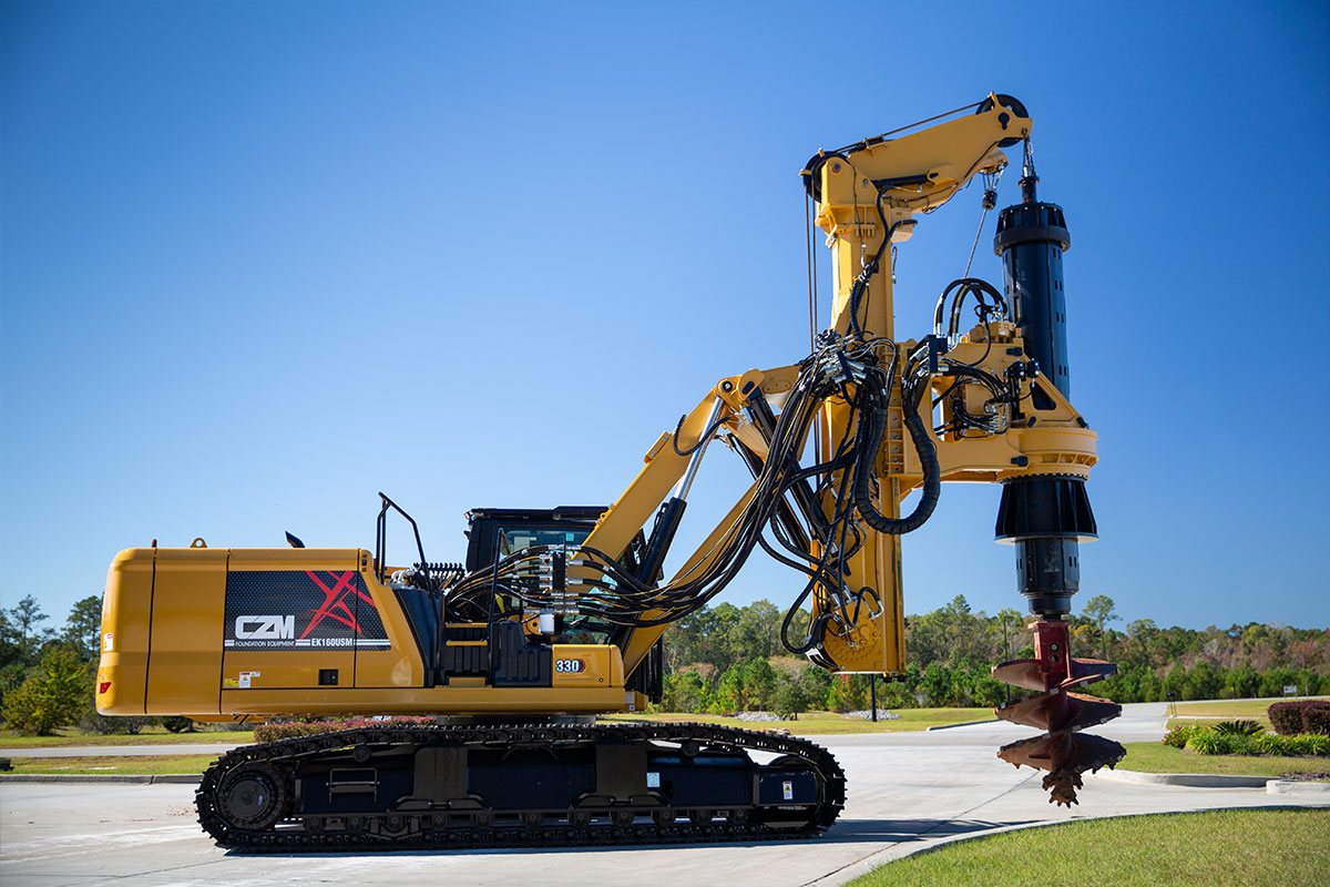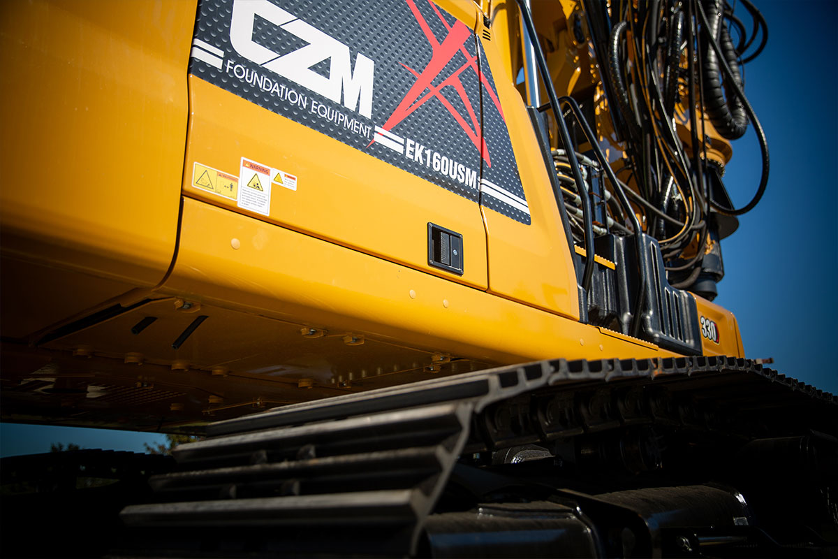 The EK160USM is a specialized machine designed by CZM for the foundations of Transmission Lines. It has a special parallelogram, where the tilt cylinders face down, allowing it work under very low overhead (20ft). The rotary has a large inner passage which allows the use of a robust 6 element kelly bar, drilling down to 65ft at full torque. It can be equipped with a self erecting counter weight for easy set up and brake down.