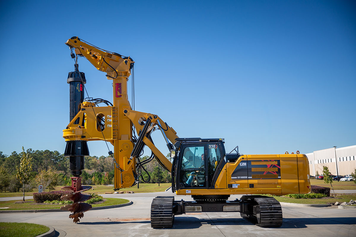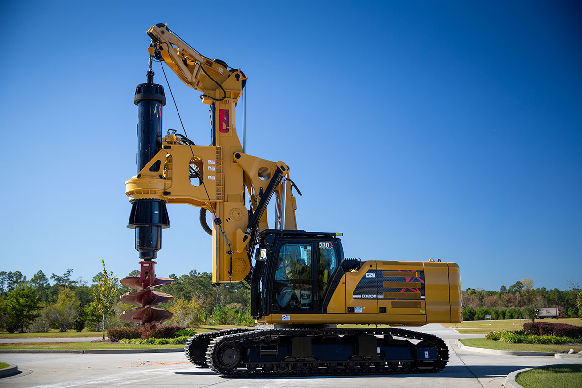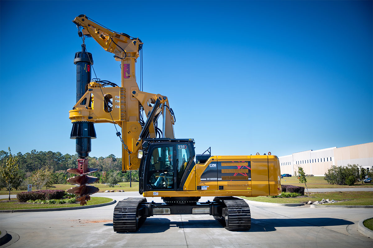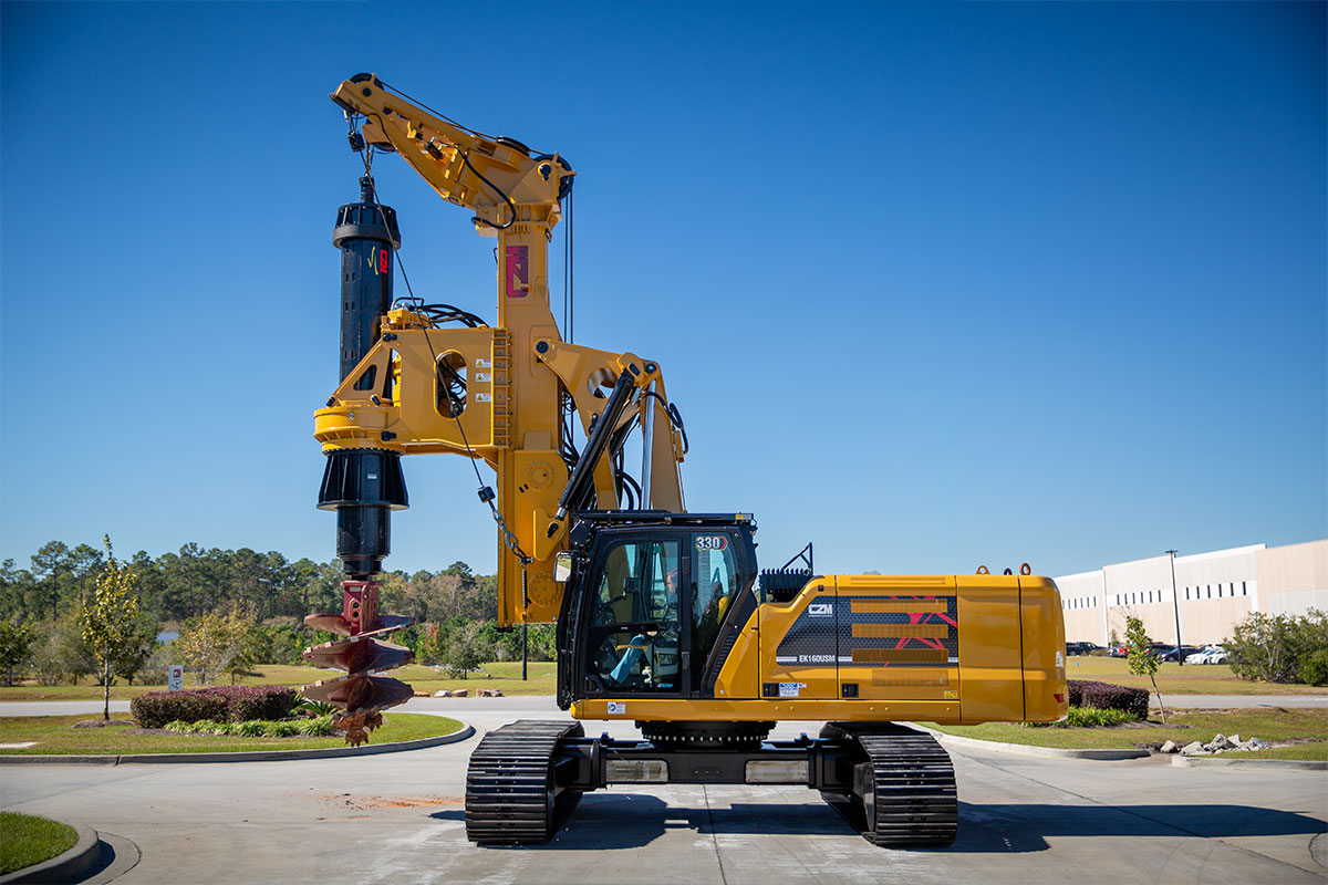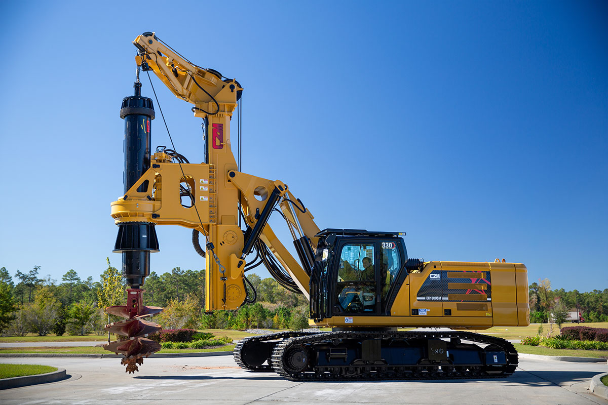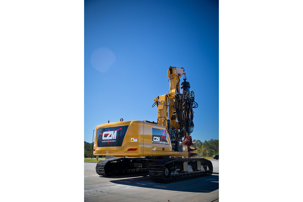 The EK160USM is a specialized machine designed by CZM for the foundations of Transmission Lines. It has a special parallelogram, where the tilt cylinders face down, allowing it work under very low overhead (20ft). The rotary has a large inner passage which allows the use of a robust 6 element kelly bar, drilling down to 65ft at full torque. It can be equipped with a self erecting counter weight for easy set up and brake down.