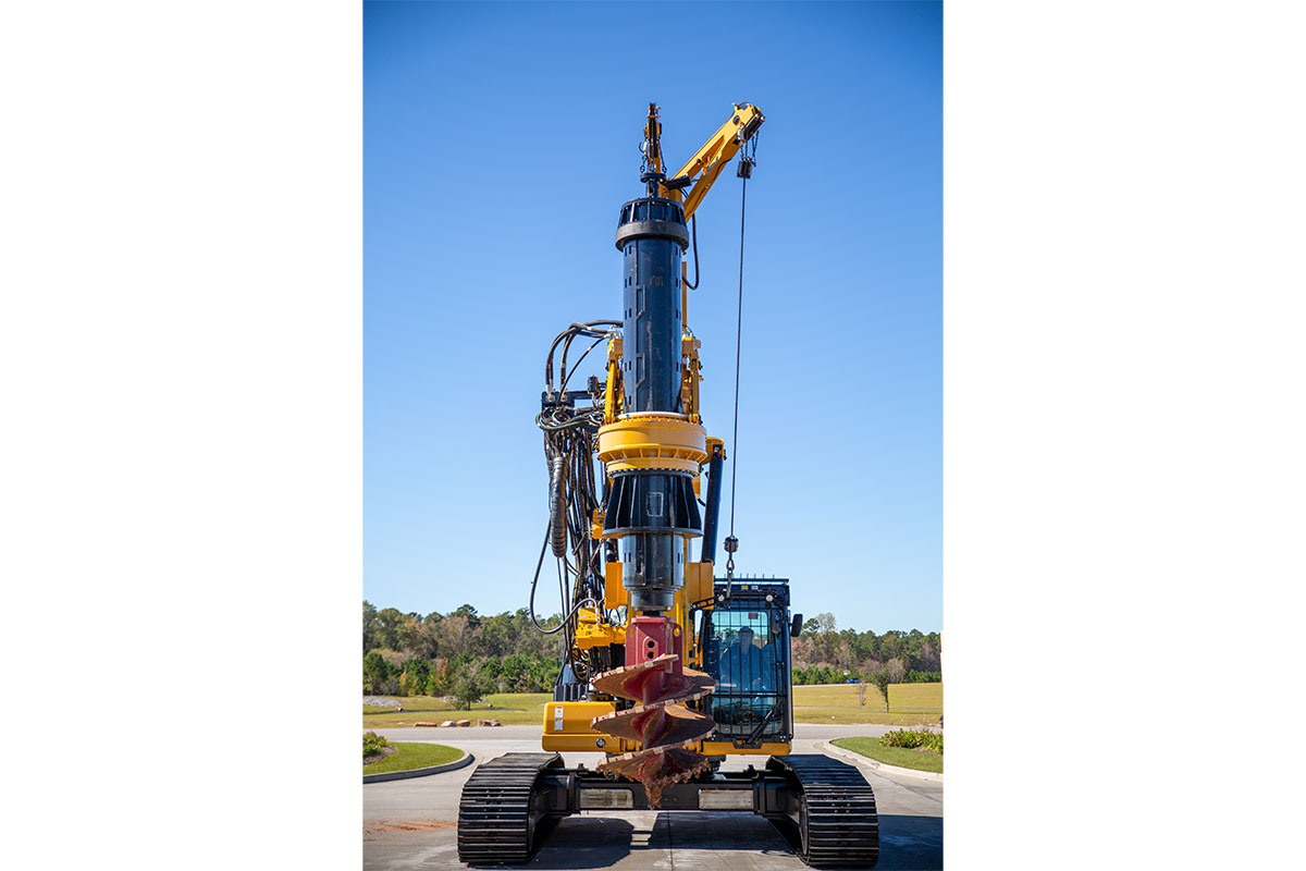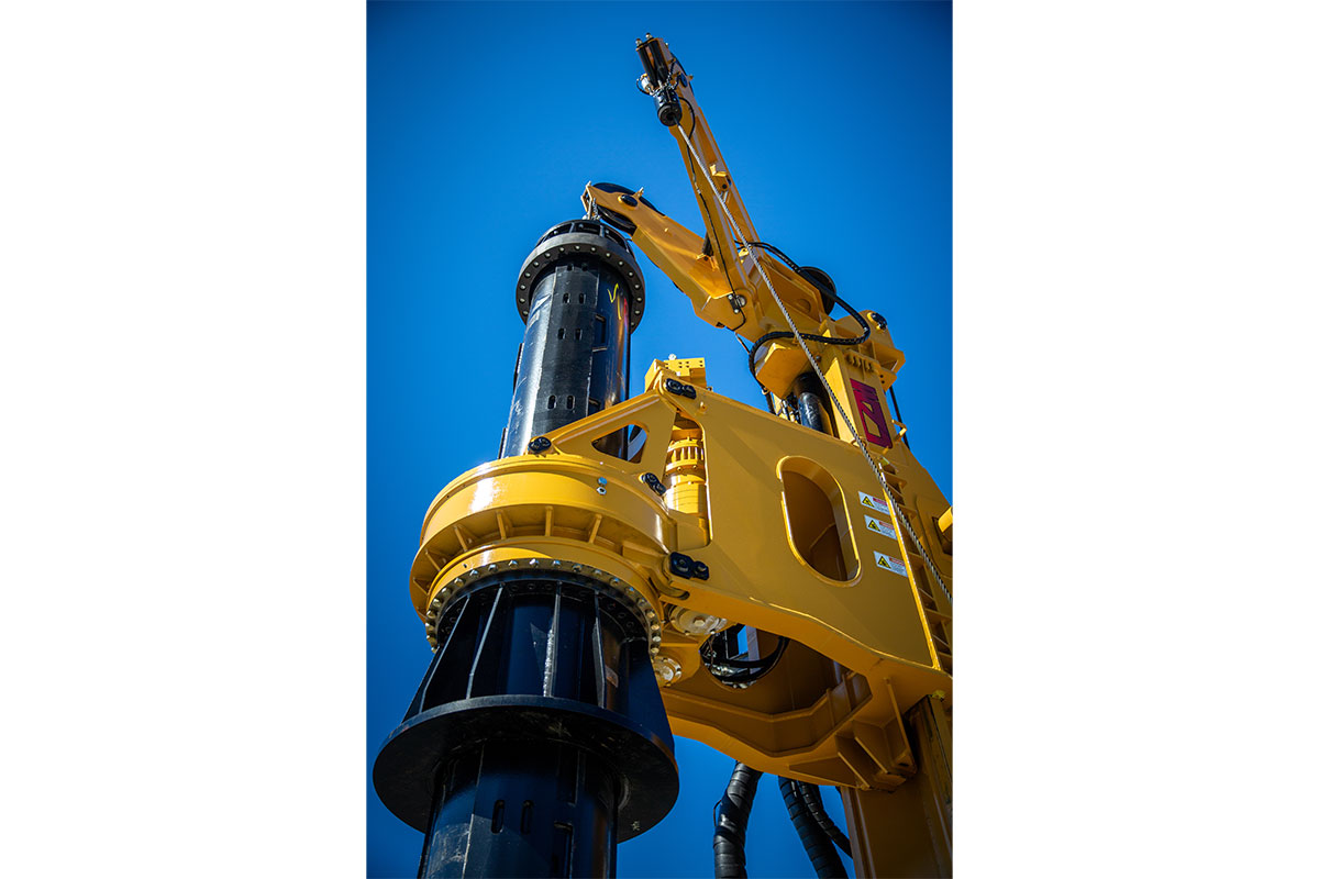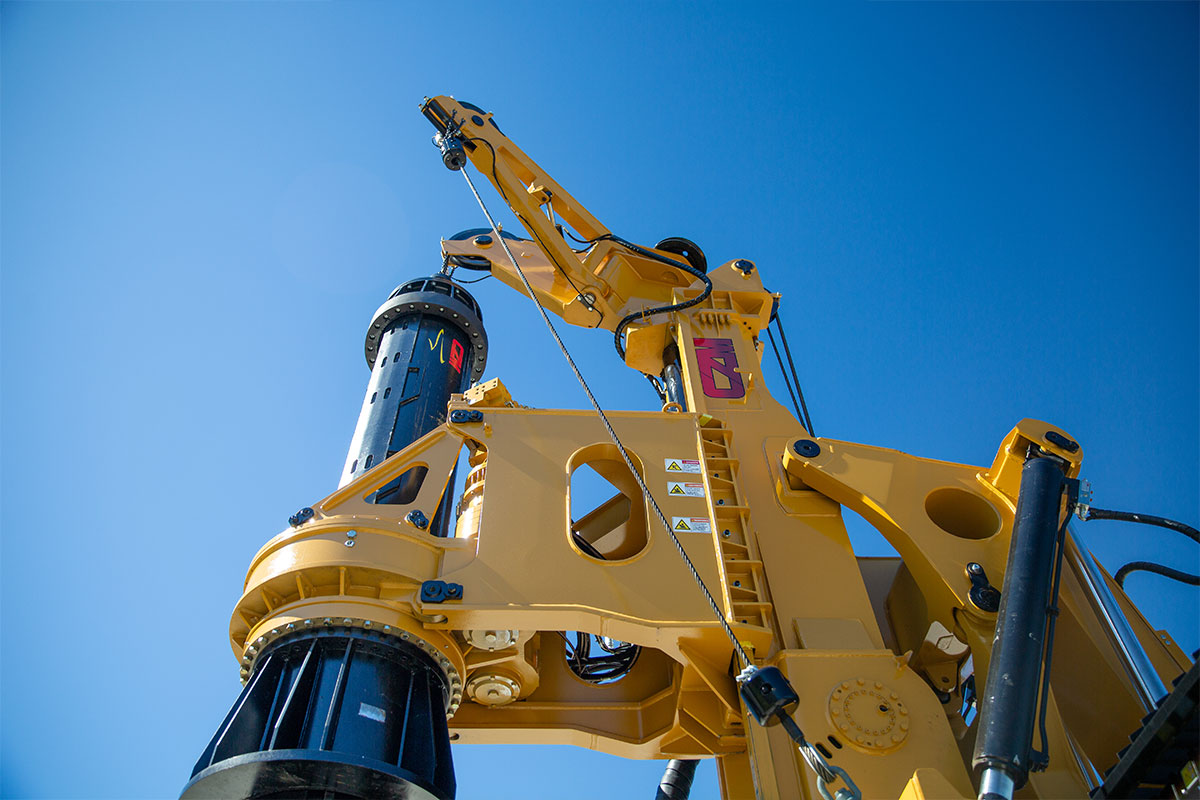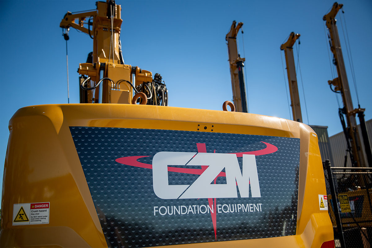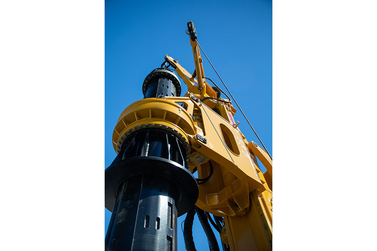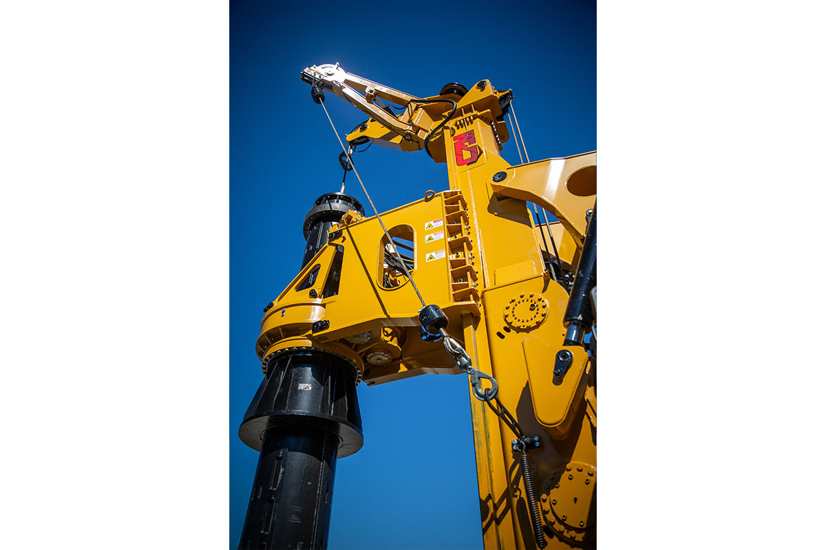 The EK160USM is a specialized machine designed by CZM for the foundations of Transmission Lines. It has a special parallelogram, where the tilt cylinders face down, allowing it work under very low overhead (20ft). The rotary has a large inner passage which allows the use of a robust 6 element kelly bar, drilling down to 65ft at full torque. It can be equipped with a self erecting counter weight for easy set up and brake down.