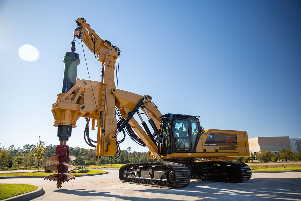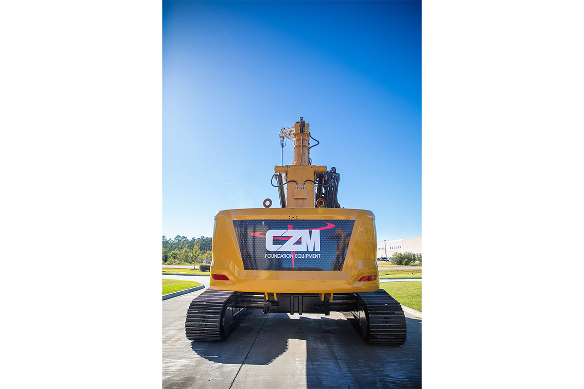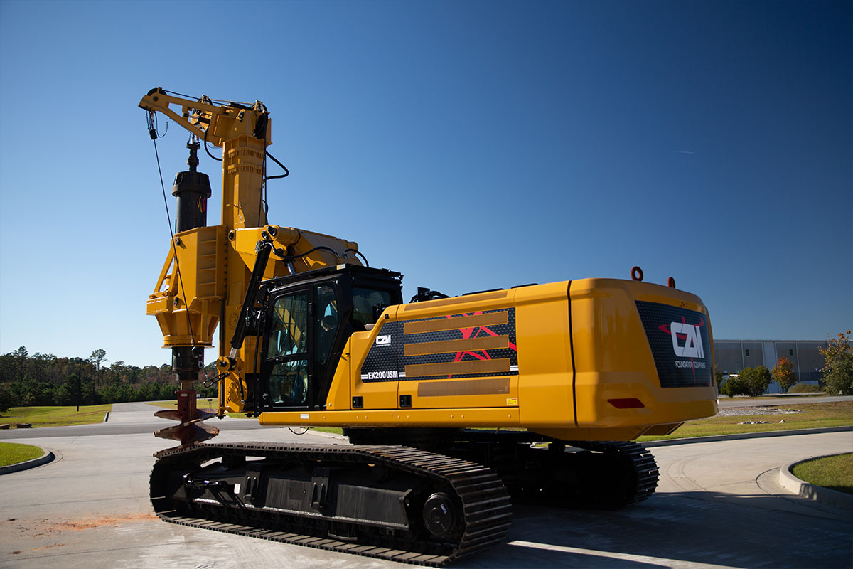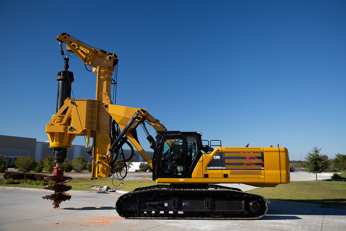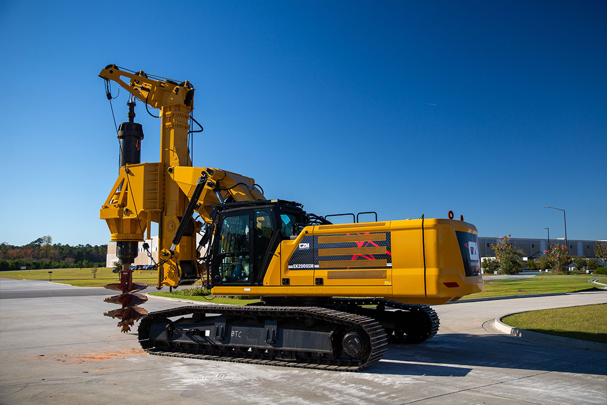 The EK200USM is a specialized machine designed by CZM for the foundations of Transmission Lines. It has a special parallelogram, where the tilt cylinders face down, allowing it work under very low overhead (20ft). The rotary has a large inner passage which allows the use of a robust 6 element kelly bar, drilling down to 60ft at full torque. It can be equipped with a self erecting counter weight for easy set up and brake down.