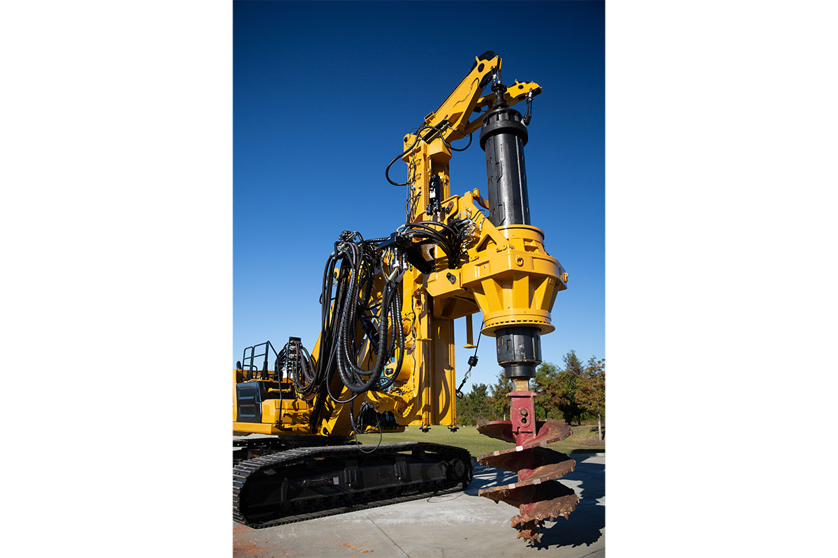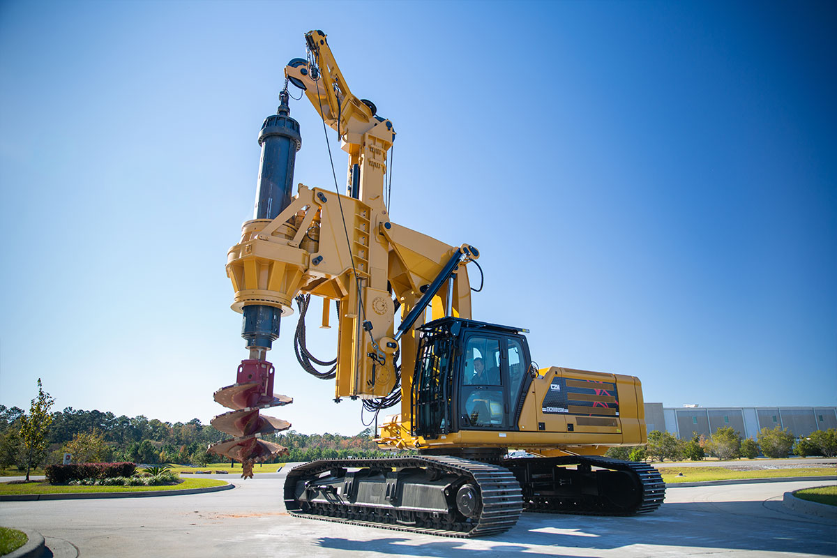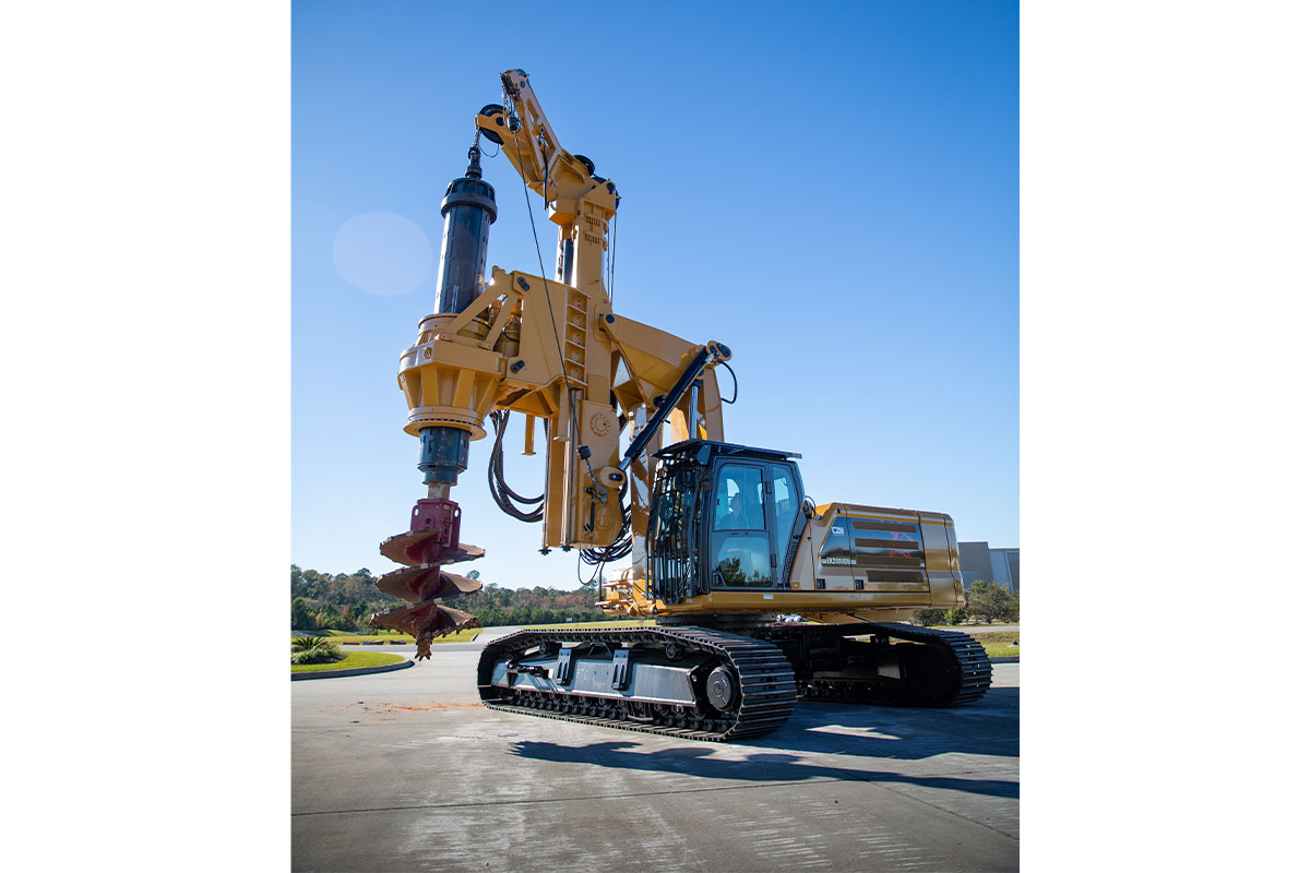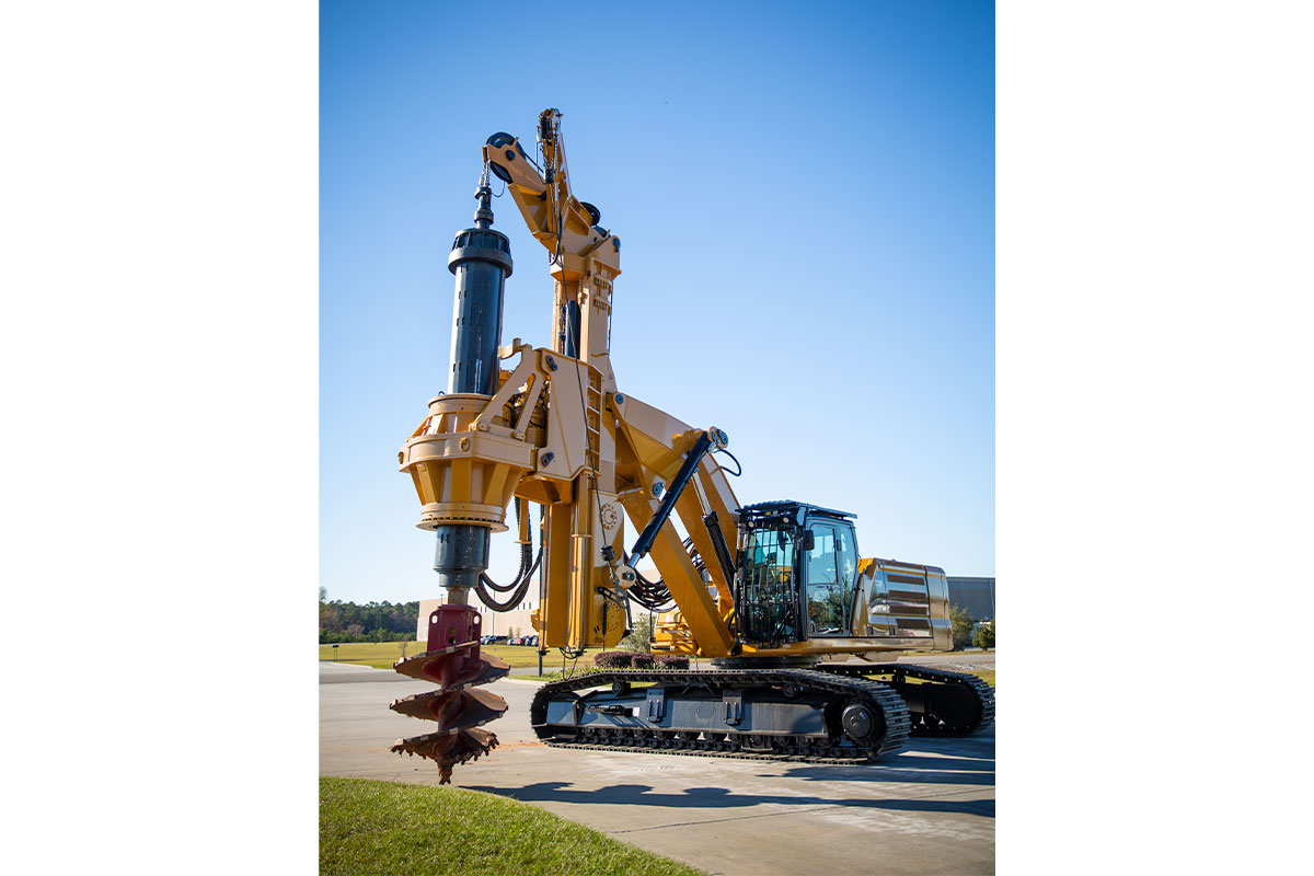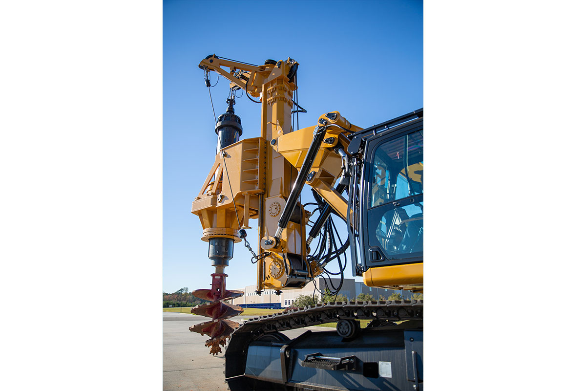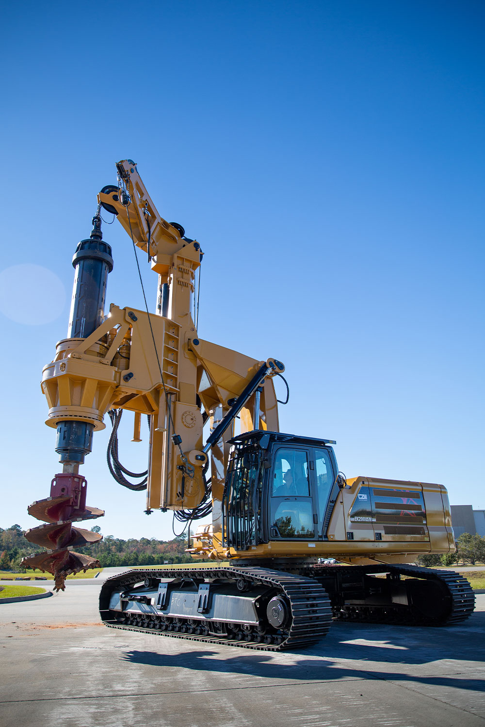 The EK200USM is a specialized machine designed by CZM for the foundations of Transmission Lines. It has a special parallelogram, where the tilt cylinders face down, allowing it work under very low overhead (20ft). The rotary has a large inner passage which allows the use of a robust 6 element kelly bar, drilling down to 60ft at full torque. It can be equipped with a self erecting counter weight for easy set up and brake down.