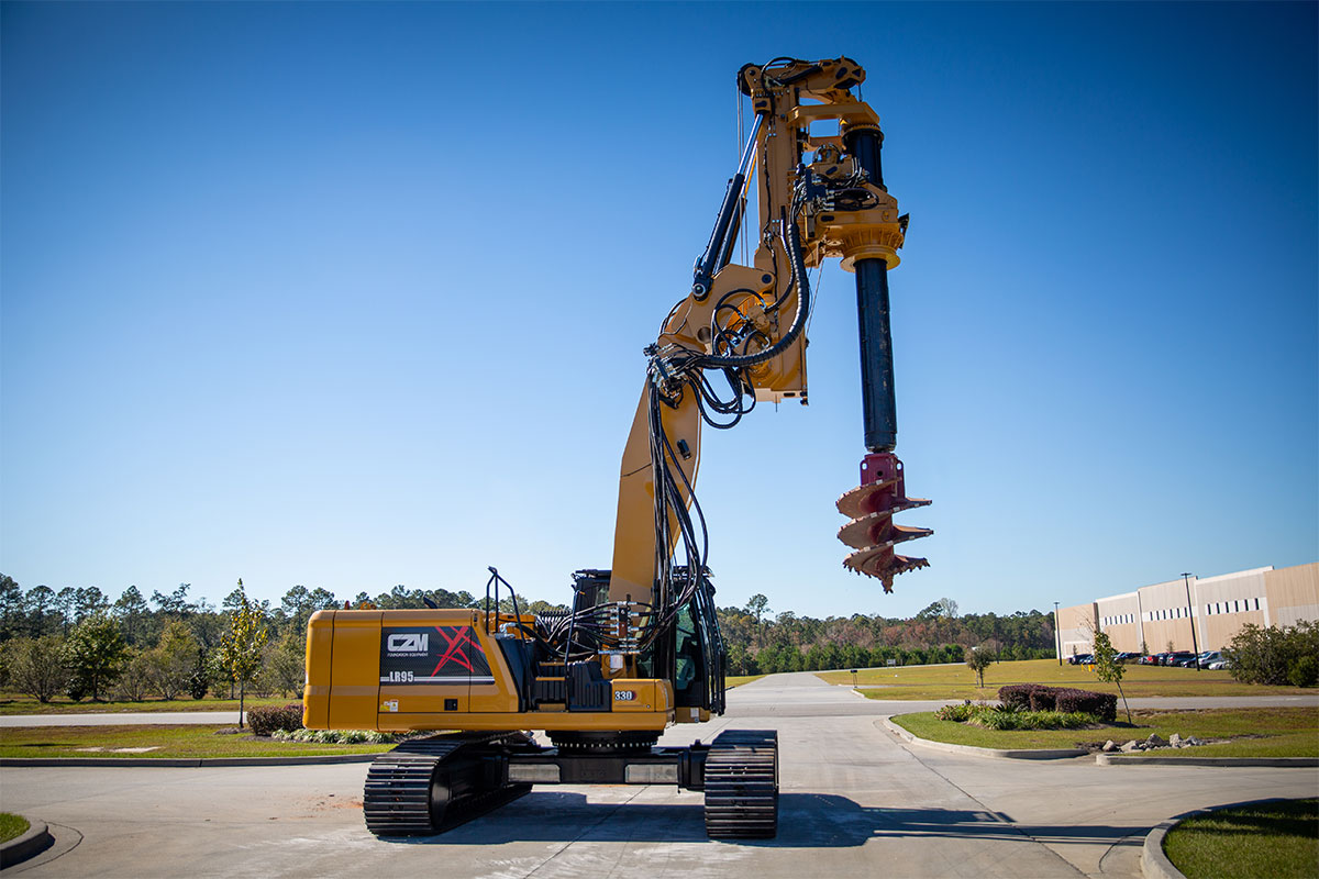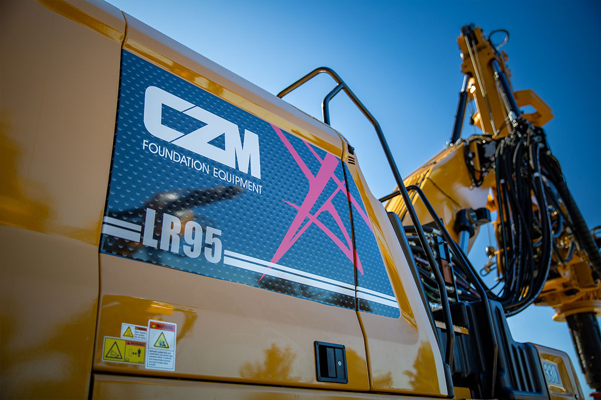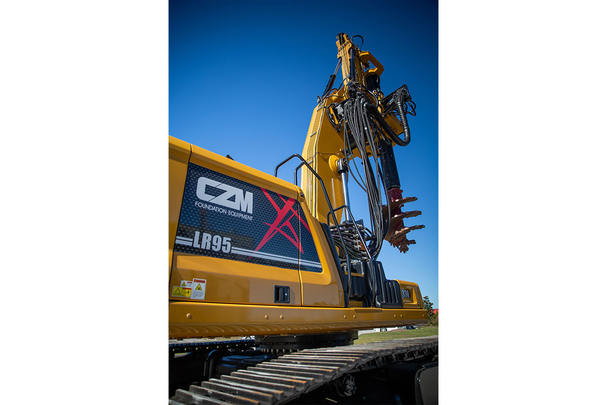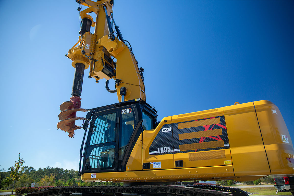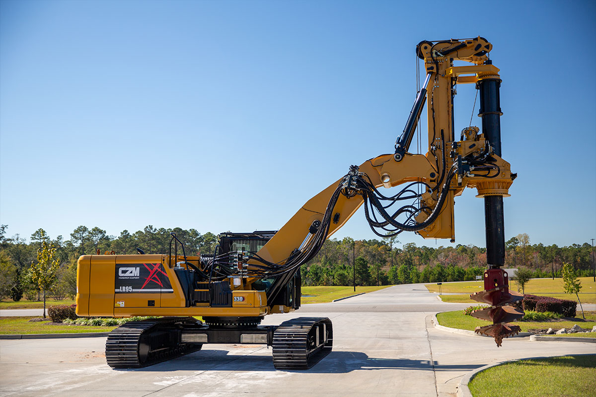 The LR95 is the medium size model of CZM’s Long Reach series, which is mounted on a Cat® 330 Next Gen with variable undercarriage. It has a special designed boom with 2 lift cylinders which allows for a higher torque and crowd force to be applied to the tool, which aligned with interlocking Kelly bars makes it efficient on rock and hard soil drilling. Round Friction bars are also available for high production on softer soils. The long reach configuration makes it ideal to applications such as sound bearing walls, transmission lines and utilities, drilling on a steep slopes, and difficult to reach holes.
